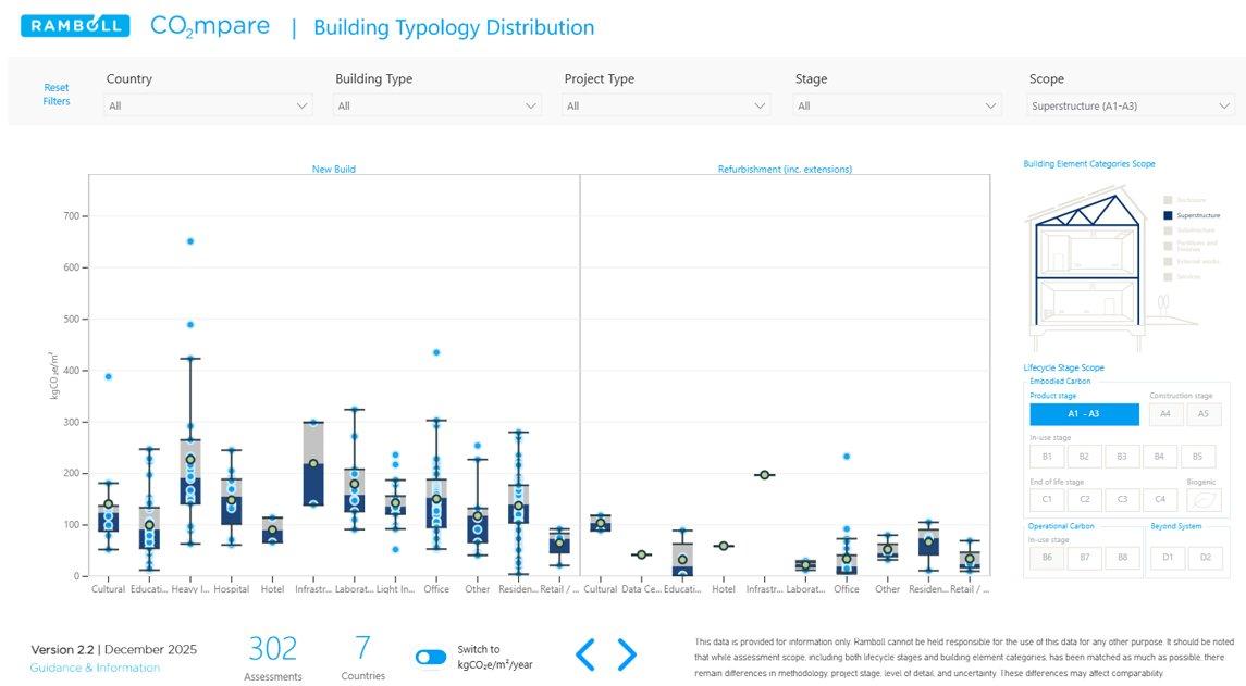 Ramboll’s carbon assessment database, CO2mpare, allows industry and governments to explore and compare data for carbon emissions across more than 300 building carbon assessments.