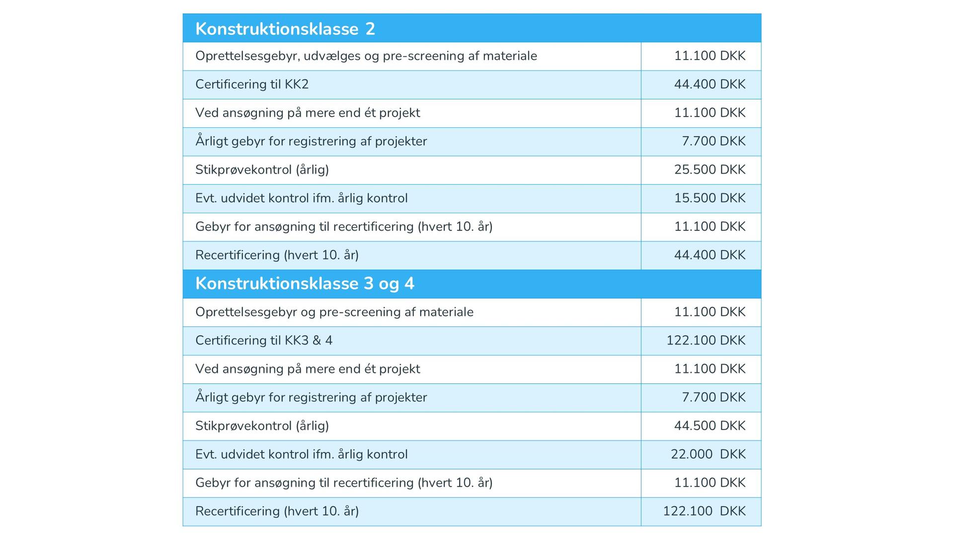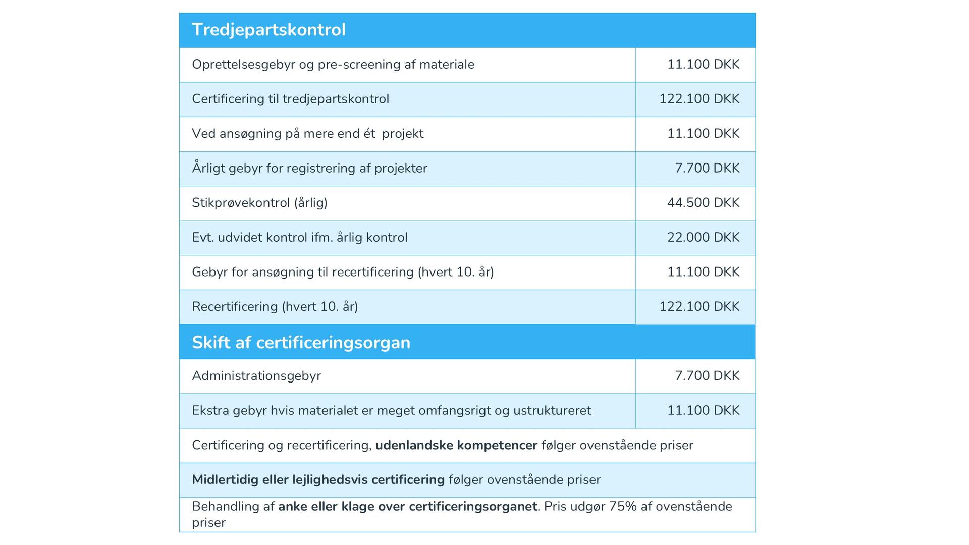 Oprettelsesgebyr betales ved ansøgning om certificering. Resterende beløb for certificering betales, når granskningen igangsættes.